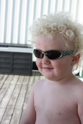 Vilka skurar som drar förbi dessa dagar! Mitt stackars lilla äppelträd tappar omogna äpplen till höger och vänster i blåsten. Undra om det blir några kvar till goda äpplepajer fram i september? Jag hittar även "palsonger" (p=k i Sigges värld) lite överallt. Sommaren träning har gett resultat och nu är blöjorna helt väck på dagtid och det går riktigt bra trots några olyckor då och då. Baksidan är att Sigge helst vill gå runt näck hela tiden om han fick...därav dessa ständiga fall-palsonger! ;-)